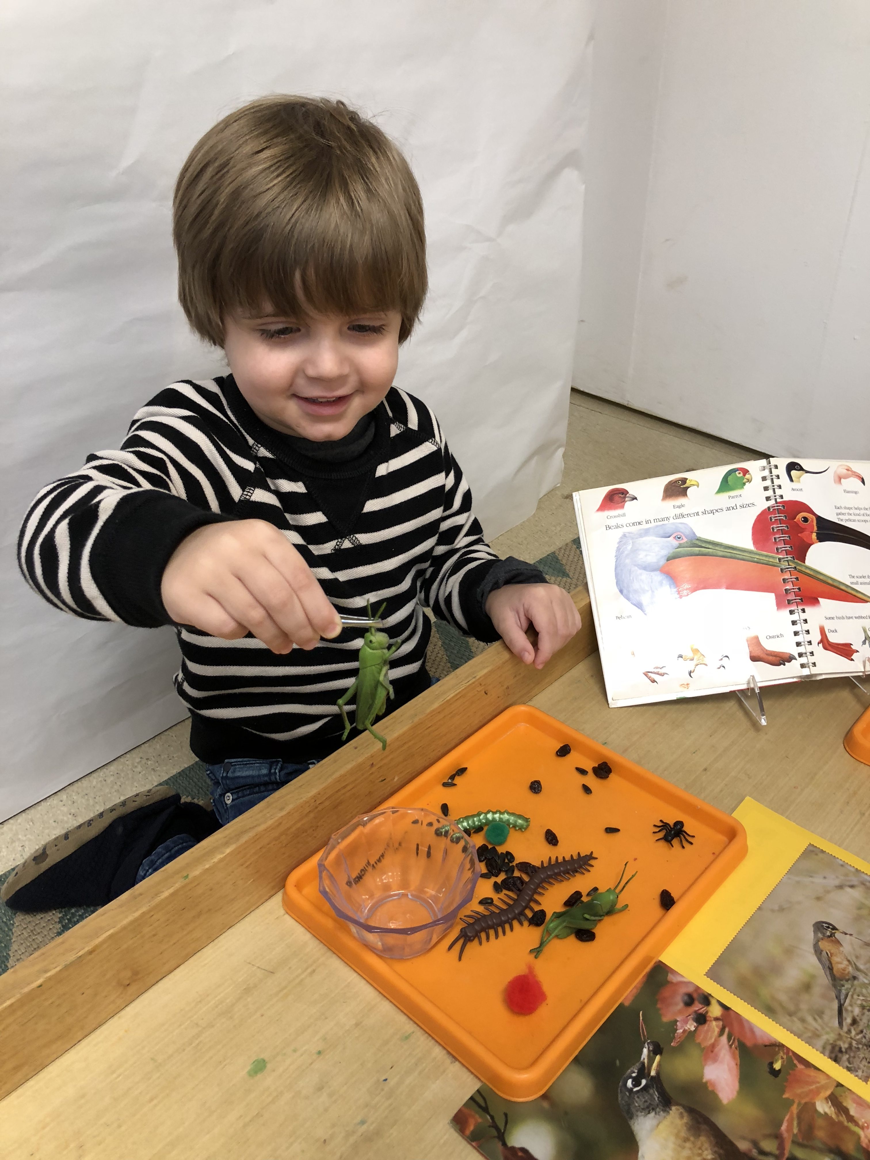 Although the Threes and Fours classes studied the same topic for their deep study, it started for two very difference reasons. The Three Class have a class “animal” that differs each year that they use for their attendance tags. This year their tags are birds. Starting the year off there were bird’s nests and stuffed birds and many beautiful non-fiction books on birds in the classroom as provocations. One of their classmates also raises chickens at her home and she and her mom shared their care and their eggs with the class. The children became interested in learning more about the real creatures based on playing with the toys and observing the nests. The Fours Class had two new window bird feeders hung up at eye level in the meeting area full of inviting bird seed. Watching them eagerly they became dismayed after a month of not seeing a single bird at their feeders. Going on a bird watching walk around the grounds revealed a similar fate-they did not see a single bird! Now they were determined to bring the birds back to CCNS.