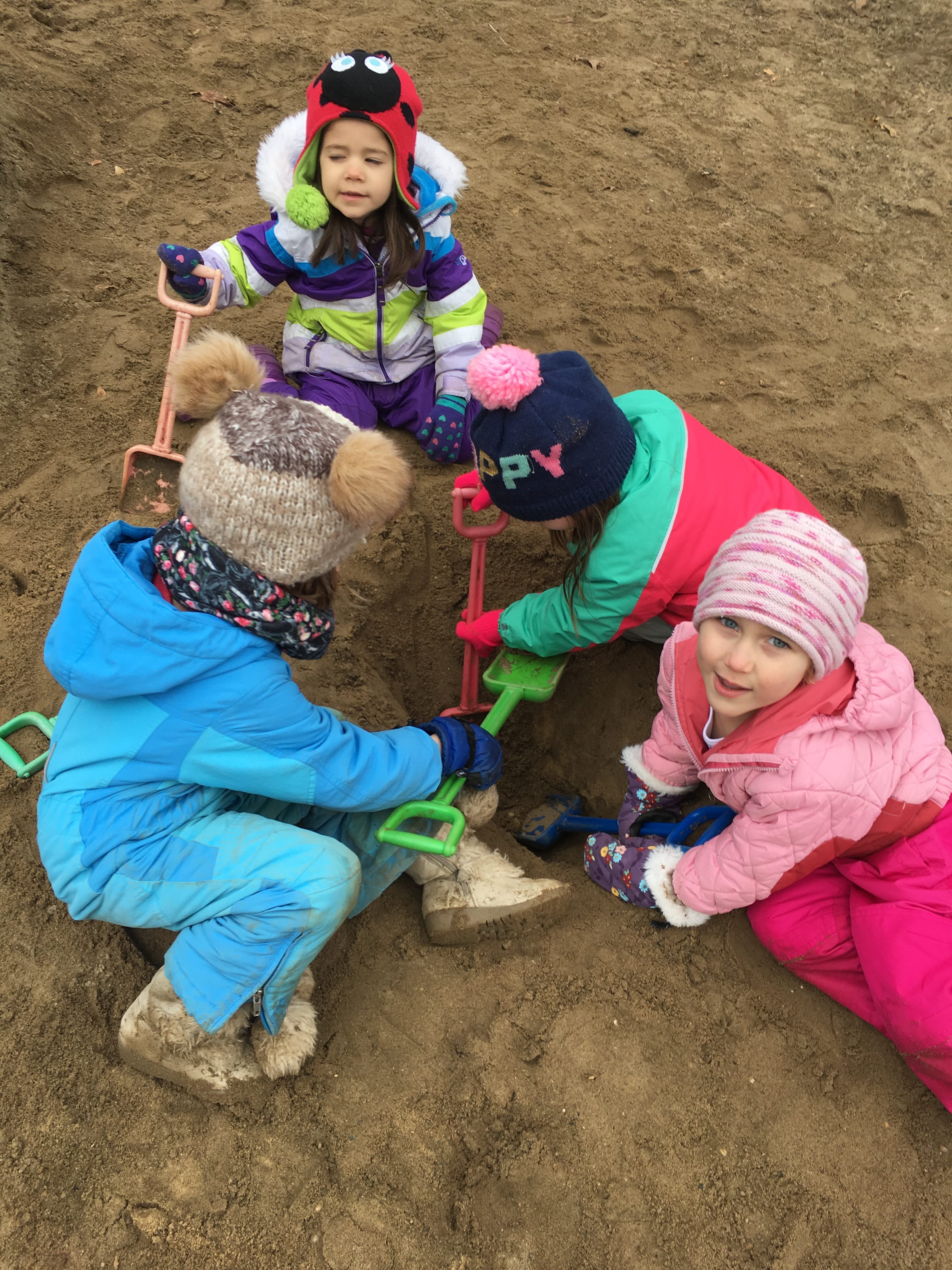 ‘Be prepared’... Like the Boy Scout motto, these children are prepared for whatever their outdoor time may bring. They know that, with the proper outdoor gear, they will be able to take another sledding run, shovel a bigger pile of snow, or be able to ‘frost’ their messy, mud pie masterpiece. When your fingers are warm and your clothes are dry, you can keep going. CCNS kids wear snow pants in winter, rubber pants for wet and muddy days, and always have a few changes of clothes in their cubby, just in case fun = really messy that day.